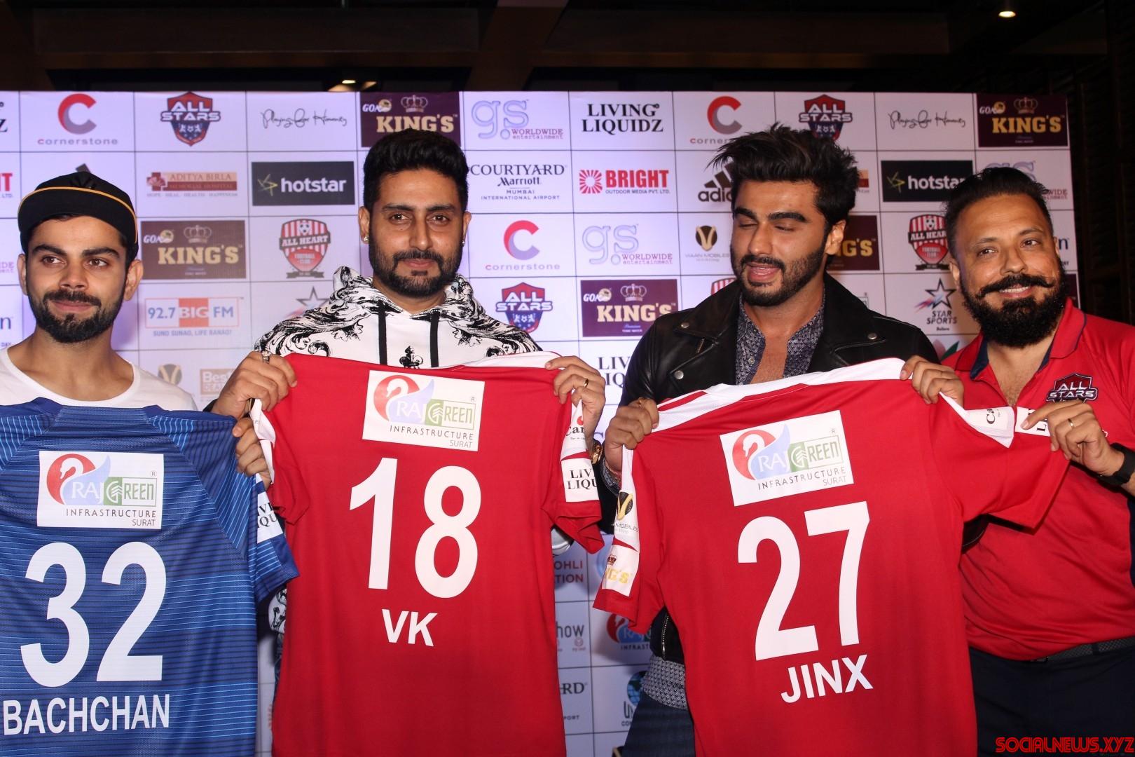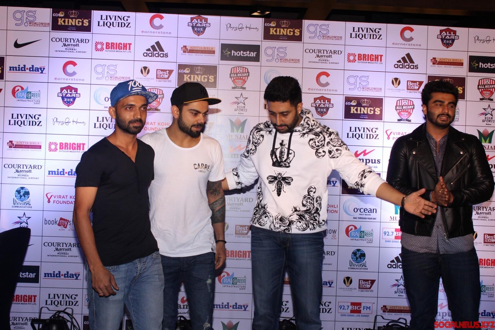 Mumbai: Indian cricketers Ajinkya Rahane, Virat Kohli, actors Abhishek Bachchan and Arjun Kapoor during the official jersey launch of celebrity Clasico 2016 by Virat Kohli Foundation and Playing for Humanity in Mumbai, on June 3, 2016. (Photo: IANS)