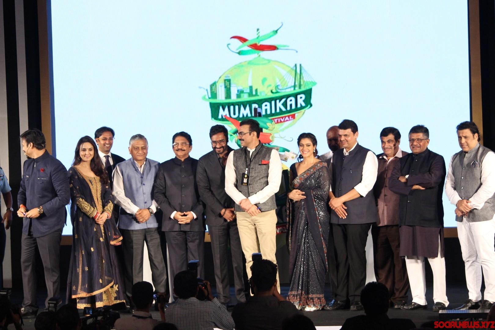 Mumbai: Actors Vivek Oberoi, Preity Zinta, Minister of External Affairs General VK Singh, actors Ajay Devgan, Kajol, Maharashtra Chief Minister Devendra Fadnavis, Union Minister of Road Transport Nitin Gadkar, Union Minister for Communications and Information Technology Ravi Shankar Prasad and actor Govinda during the Mumbaikar Festival 2016, in Mumbai, on June 3, 2016. (Photo: IANS)