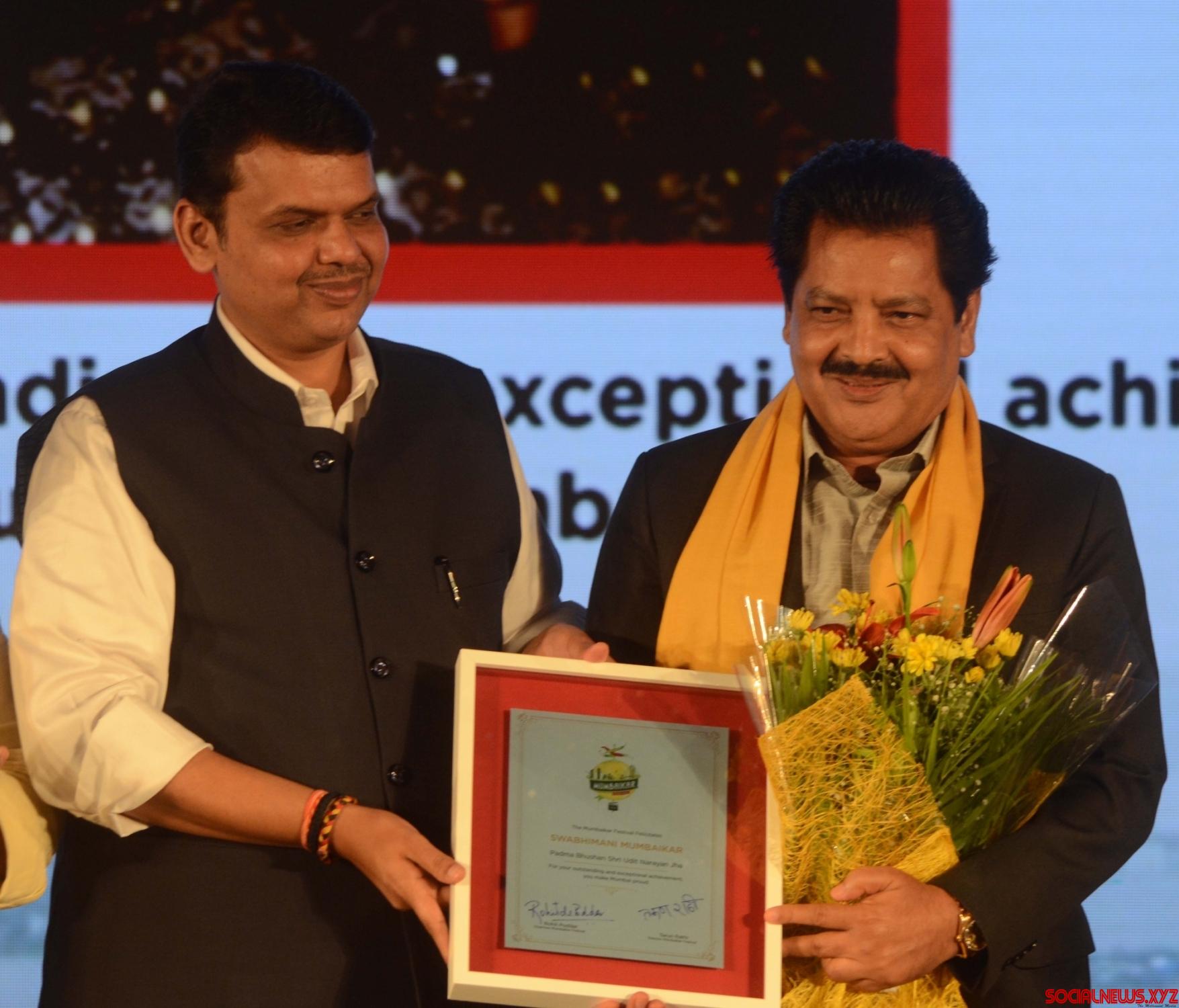 Mumbai: Maharashtra Chief Minister Devendra Fadnavis felicitate singer Udit Narayan during the “Swabhimani Mumbaikar” awards in Mumbai on June 4, 2016. (Photo: IANS)