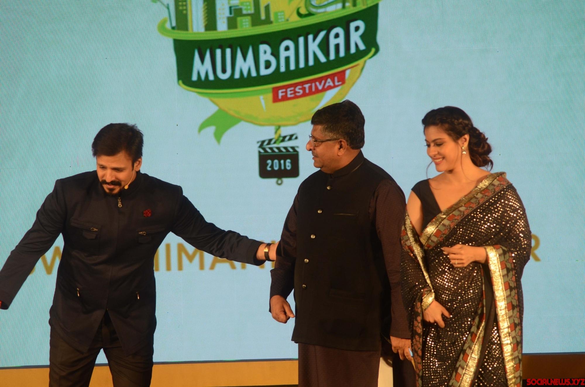 Mumbai: Union Minister Ravi Shankar Prasad, actors Vivek Oberoi and Kajol Devgan during the “Swabhimani Mumbaikar” awards in Mumbai on June 4, 2016. (Photo: IANS)