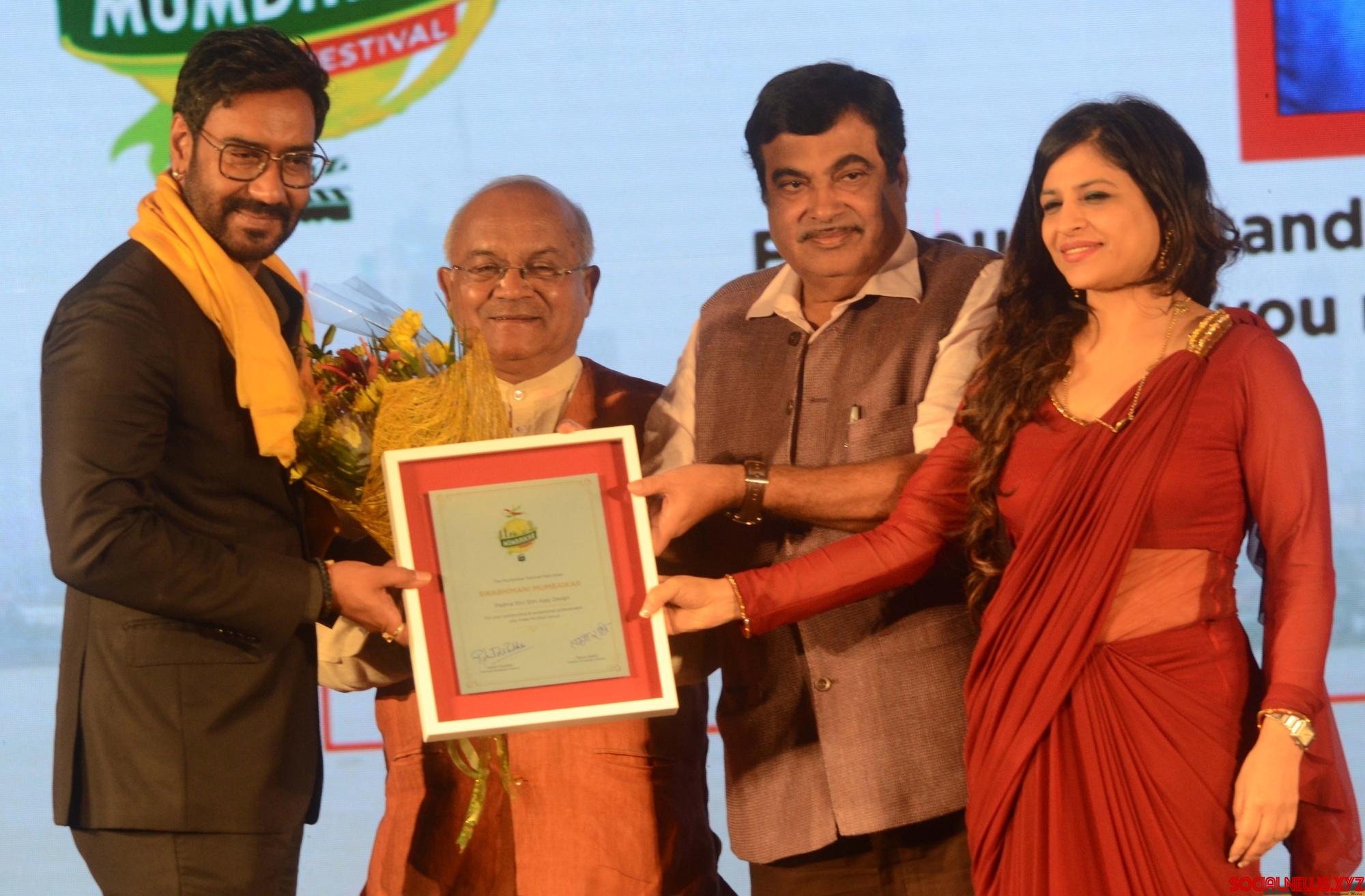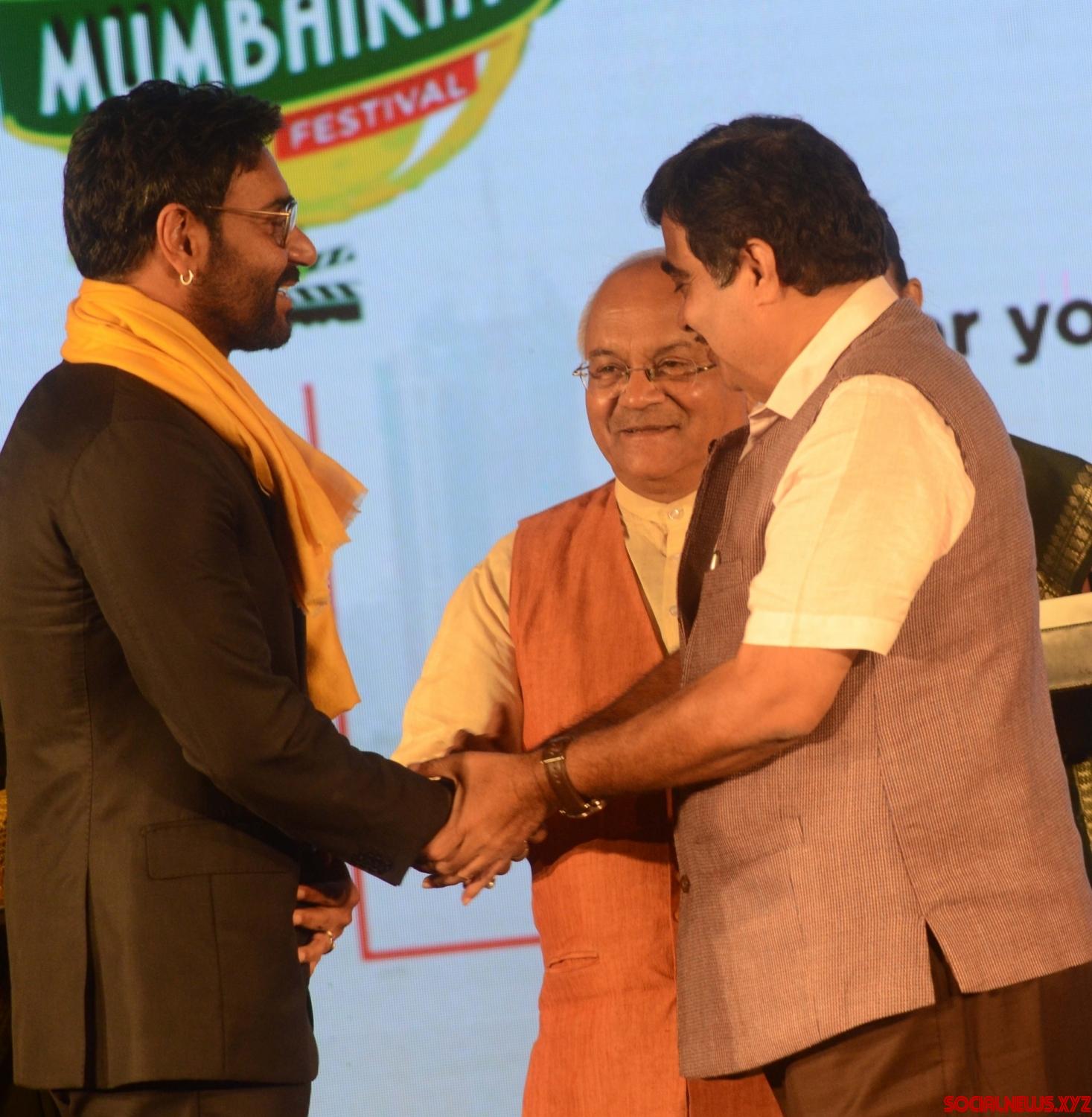 Mumbai: Union Minister Nitin Gadkari and actor Ajay Devgan during the “Swabhimani Mumbaikar” awards in Mumbai on June 4, 2016. (Photo: IANS)