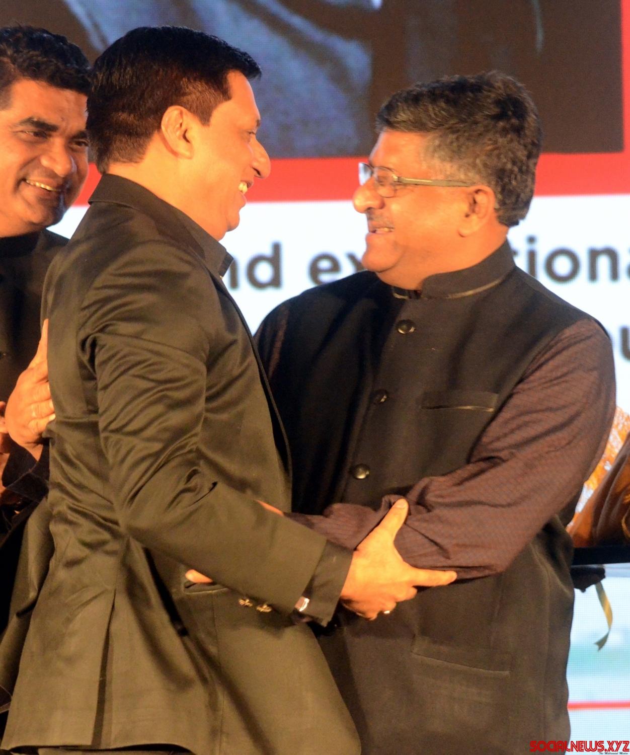Mumbai: Union Minister Ravi Shankar Prasad and director Madhur Bhandarkar during the “Swabhimani Mumbaikar” awards in Mumbai on June 4, 2016. (Photo: IANS)
