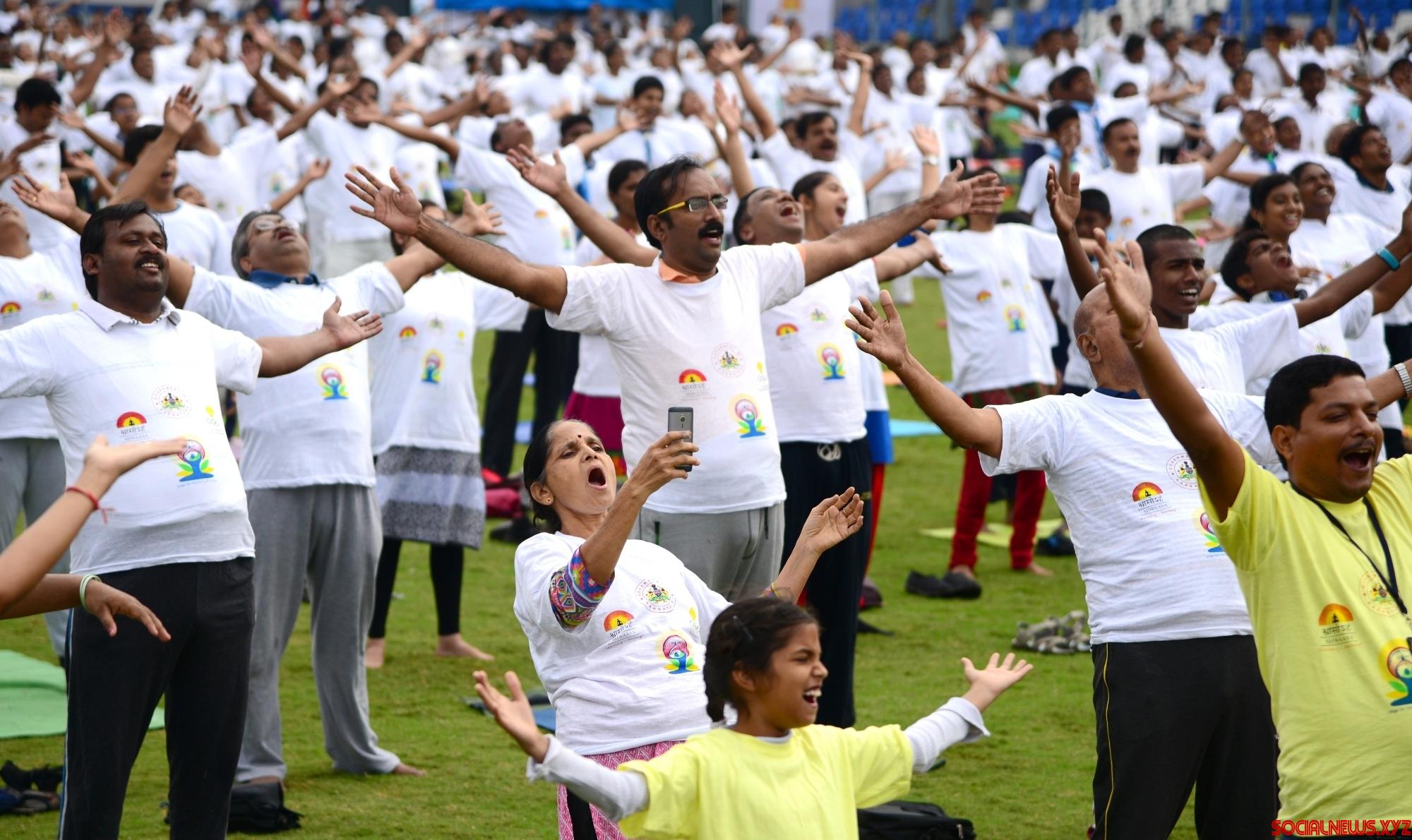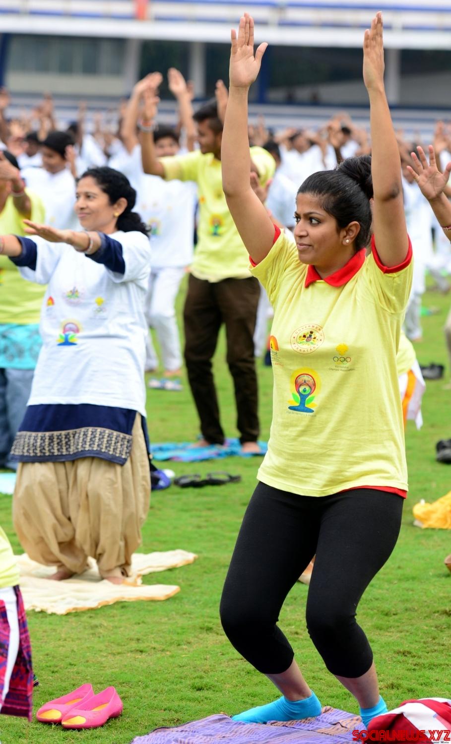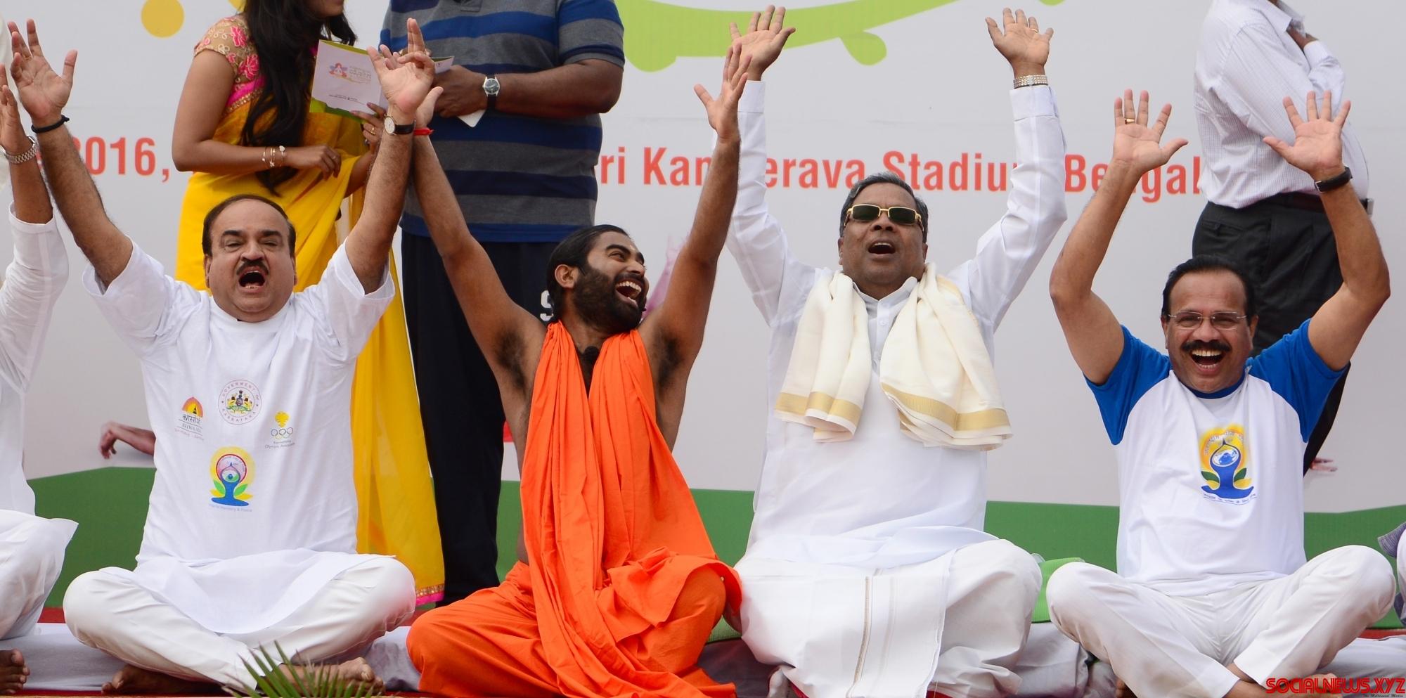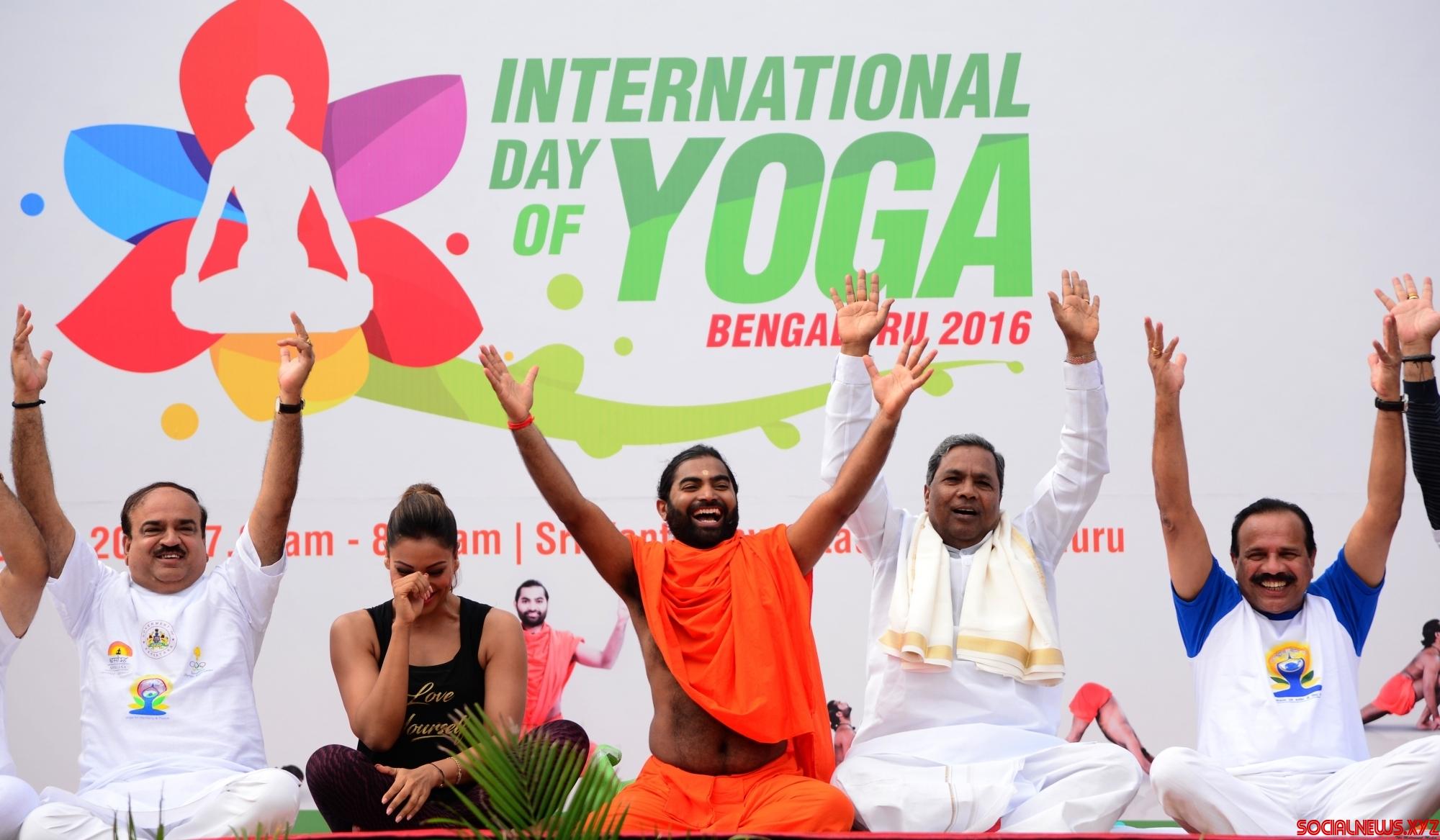 Bengaluru: Karnataka Chief Minister Siddaramaiah, Union Ministers Sadananda Gowda, Ananth Kumar and actress Bipasha Basu practice yoga asans -postures- on International Day of Yoga at Kanteerava Stadium in Bengaluru on June 21, 2016. (Photo: IANS)
