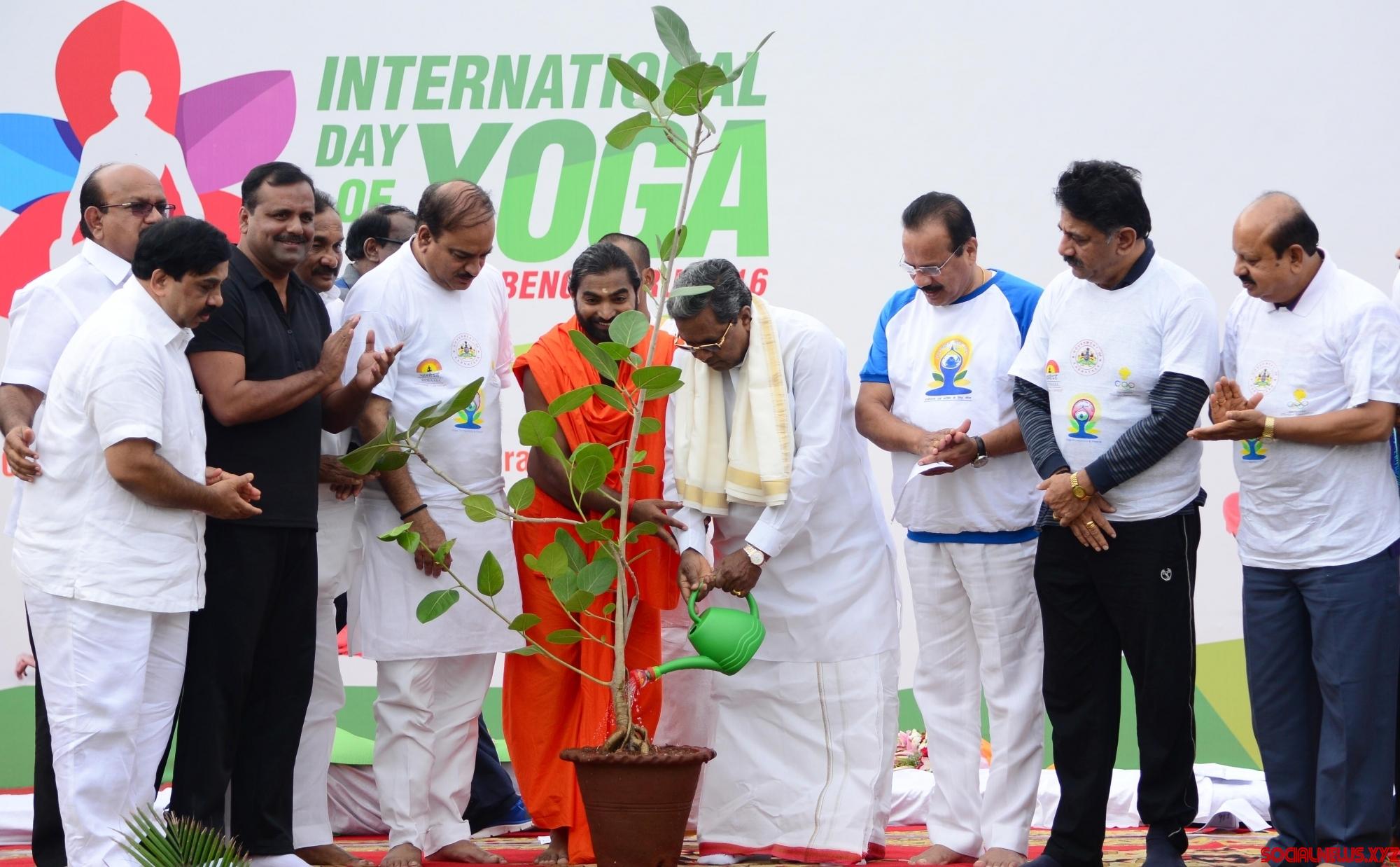 Bengaluru: Karnataka Chief Minister Siddaramaiah, Union Ministers Sadananda Gowda and Ananth Kumar during a programme organised on International Day of Yoga at Kanteerava Stadium in Bengaluru on June 21, 2016. (Photo: IANS)