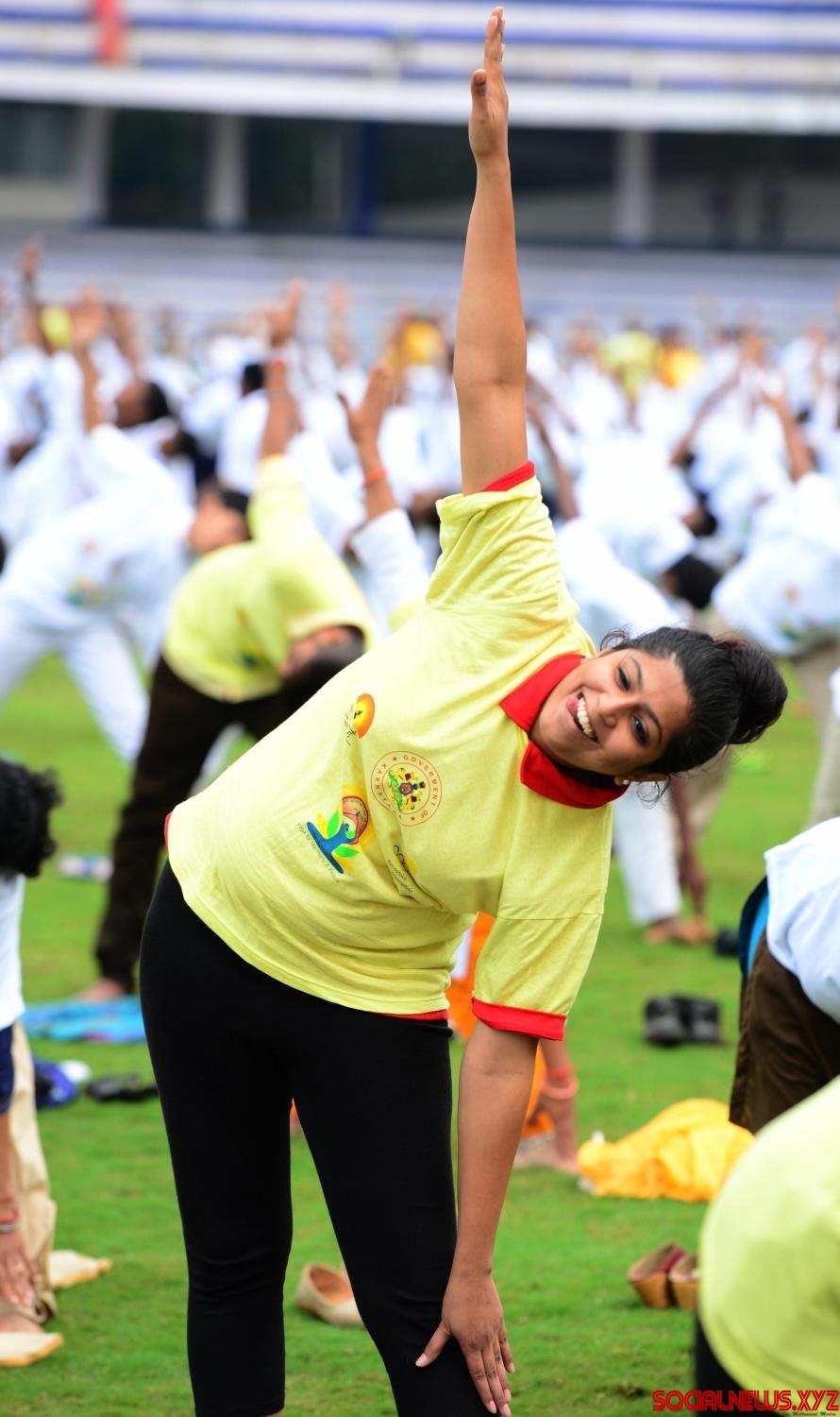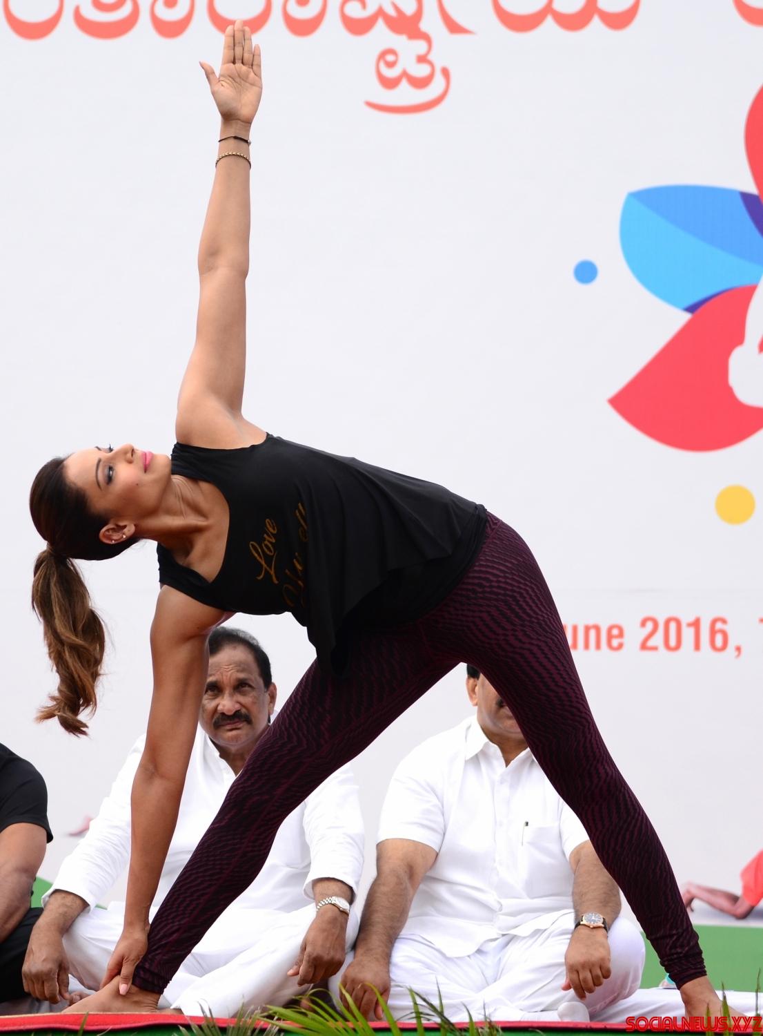 Bengaluru: Actress Bipasha Basu practice yoga asans -postures- on International Day of Yoga at Kanteerava Stadium in Bengaluru on June 21, 2016. (Photo: IANS)
