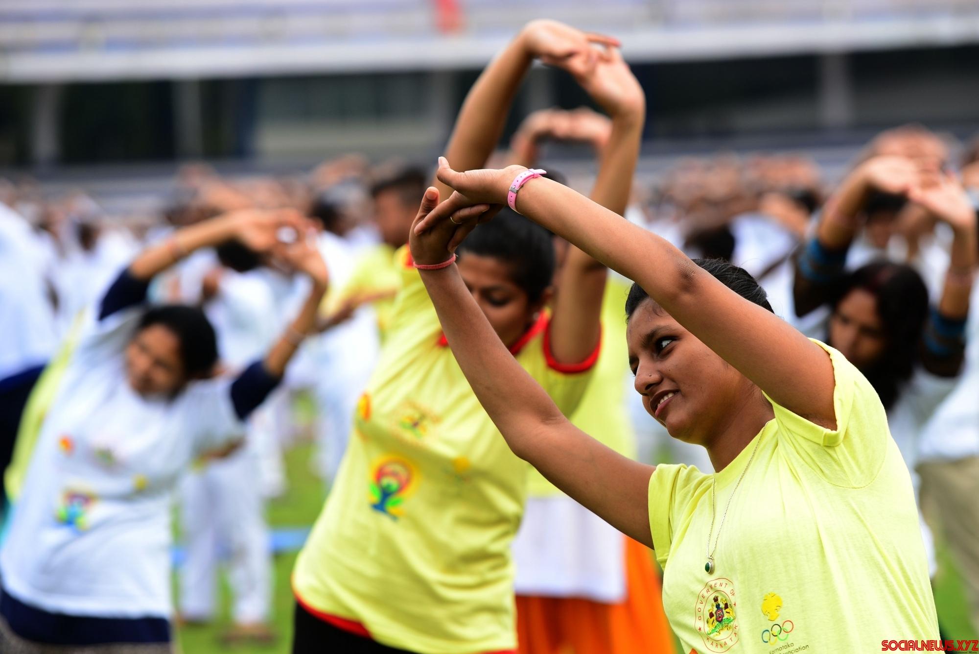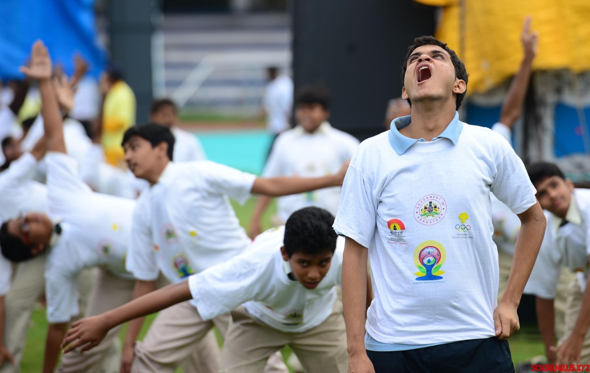 Bengaluru: People practice yoga asans -postures- on International Day of Yoga at Kanteerava Stadium in Bengaluru on June 21, 2016. (Photo: IANS)
