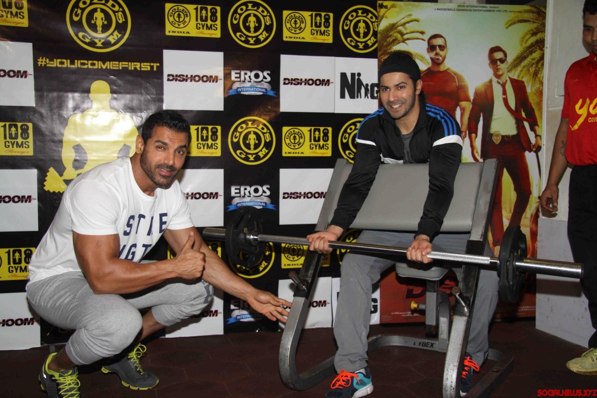 Mumbai: Actors John Abraham and Varun Dhawan during the promotion of film Dishoom at Gold’s Gym in Mumbai on July 9, 2016. (Photo: IANS)