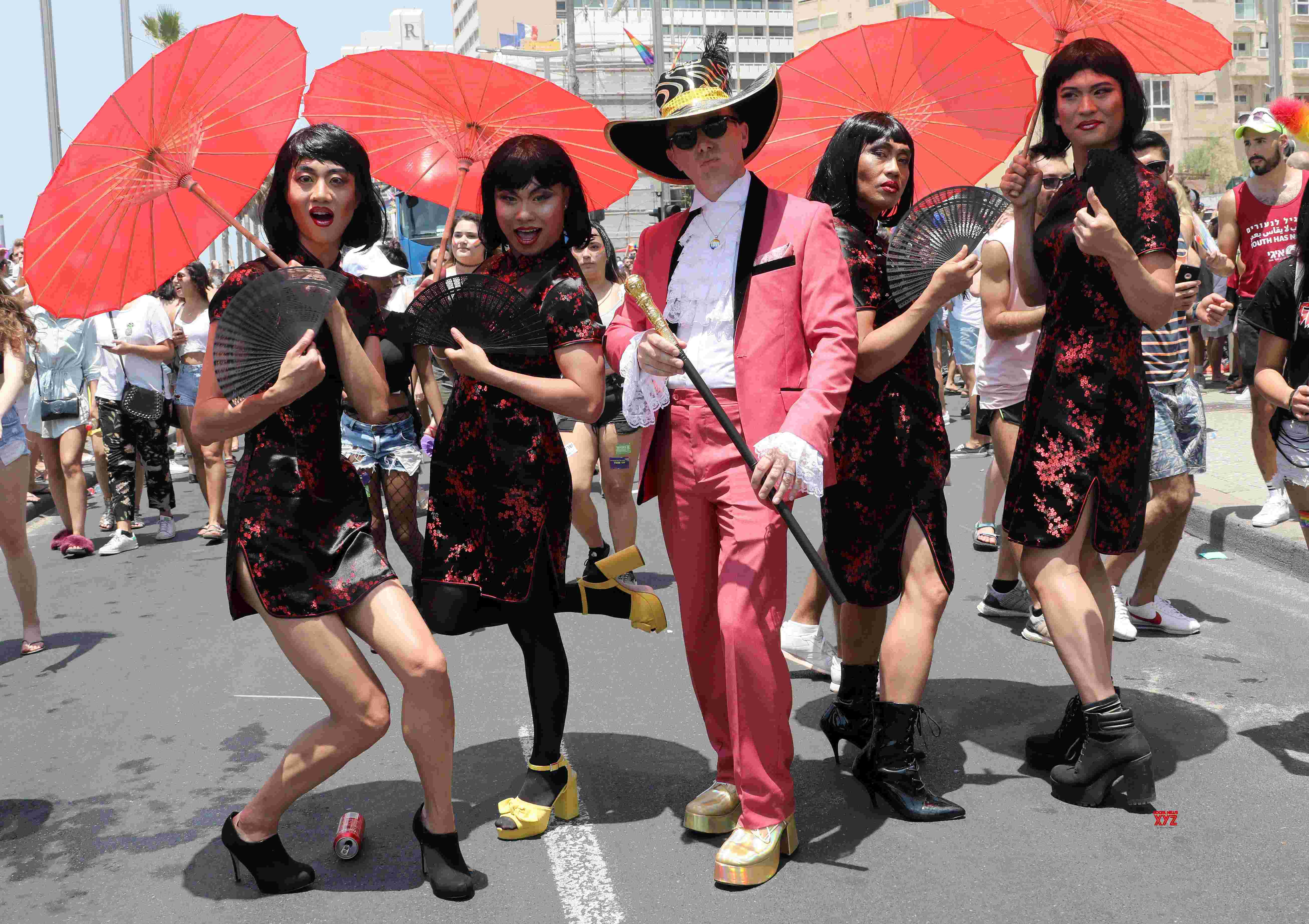 A small group of pink-clad protesters gathered near the procession to denounce the parade as a media stunt to burnish Israel's international image as a supporter of liberal values in the Middle East.