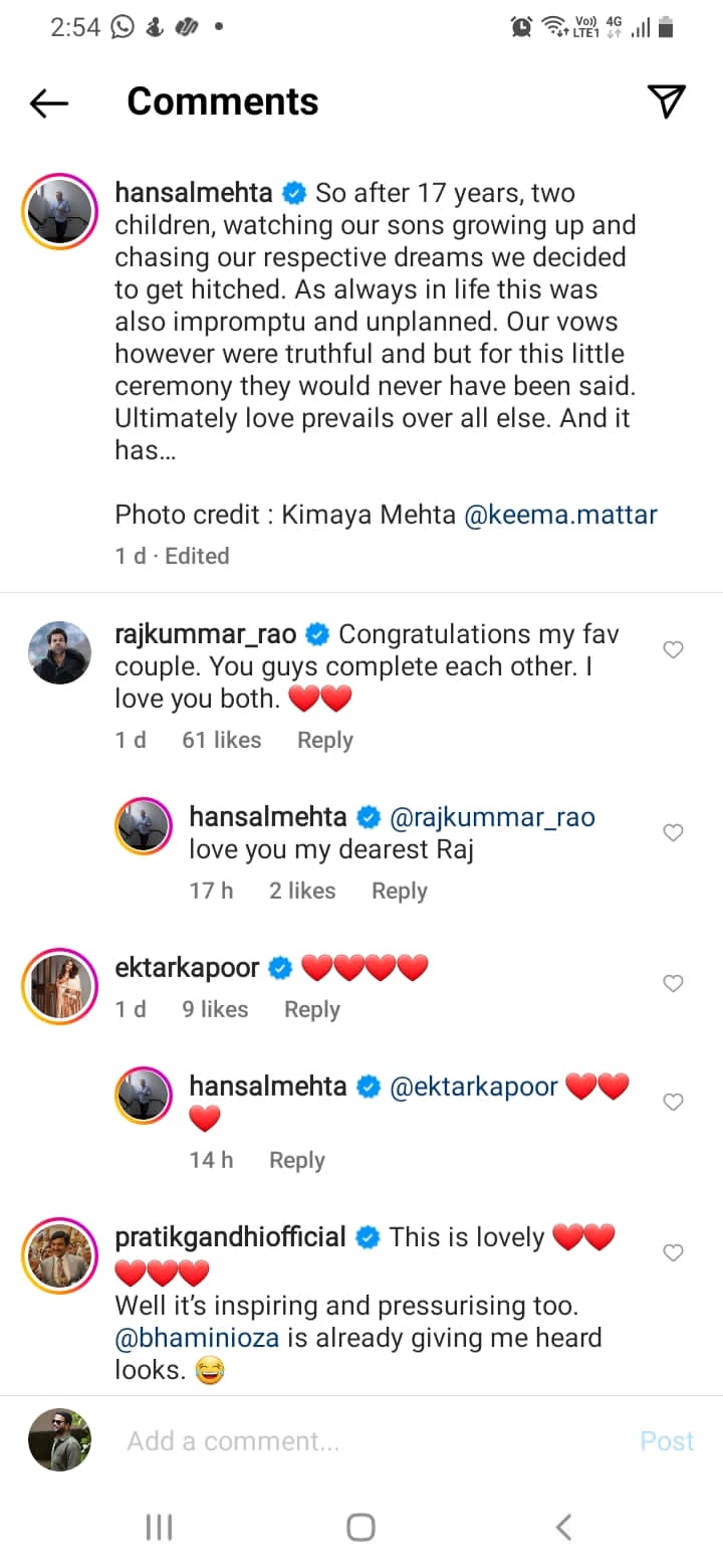 Taking this incredible news to his social media post, the newly wedded couple can be seen smiling for pictures, holding up placards that say “love” and also posing with what appears to be a marriage certificate. Sharing the pictures, Hansal Mehta said, “So after 17 years, two children, watching our sons growing up and chasing our respective dreams we decided to get hitched. As always in life, this was also impromptu and unplanned. Our vows, however, were truthful, and but for this little ceremony, they would never have been saying. Ultimately love prevails over all else. And it has…”