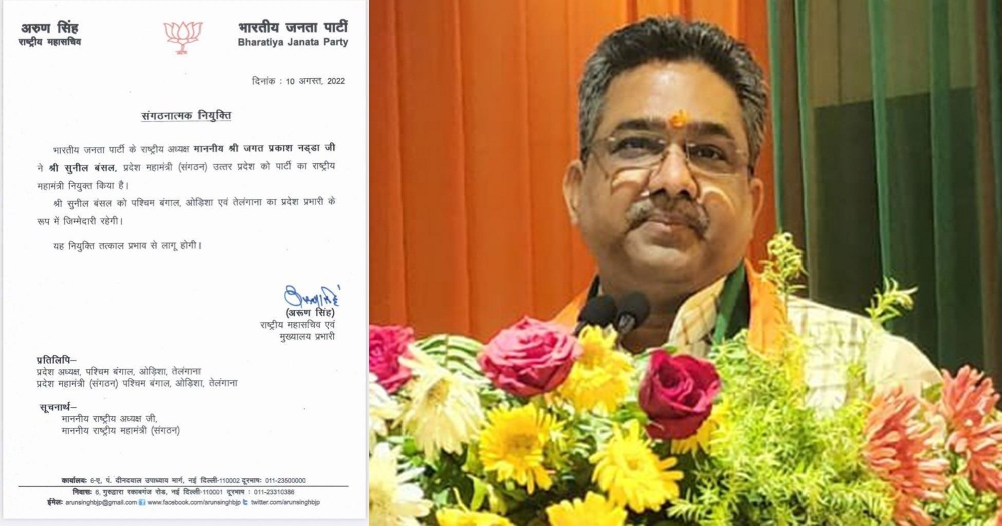 In a statement party national general secretary Arun Singh said, "BJP President J P Nadda has appointed Sunil Bansal, general secretary (organisation) Uttar Pradesh, as national general secretary. He has given responsibility of state in-charge of West Bengal, Telangana and Odisha. Appointment is effective from immediate effect."
