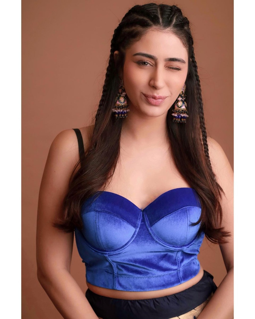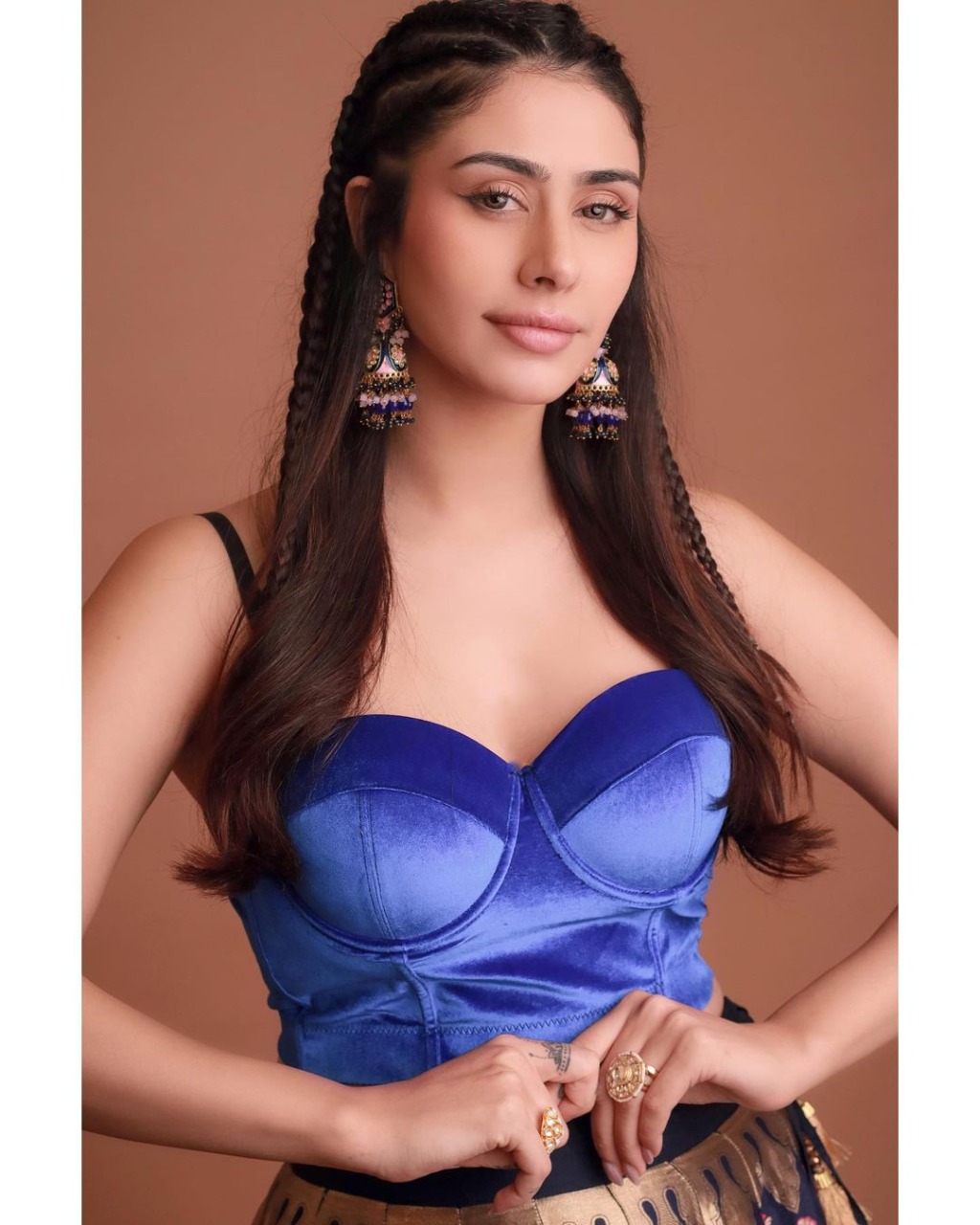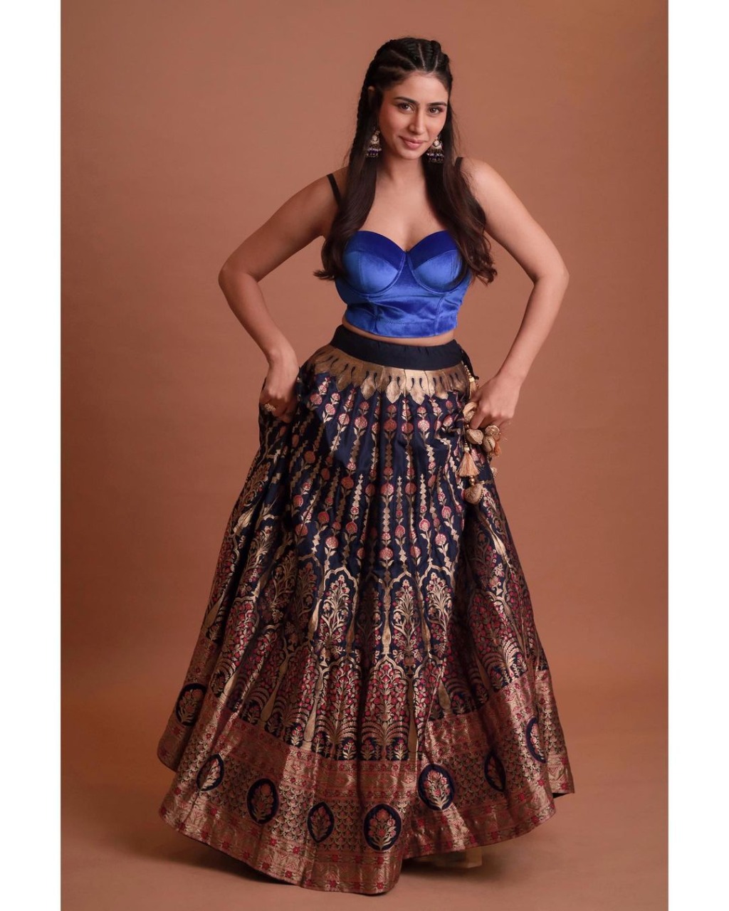 Are you a fan of game of thrones and traditional clothing but with a modern touch? If yes, then this look of Warina will suit you best. The actress looked breathtaking in this banarasi handwoven lehenga but with a modern twist. Warina paired this with a sleeveless blue velvet crop top.Combining the right accessories with your outfit is sure to bring you under the spotlight. Warina paired this outfit with long traditional jhumkaas. Talking about the hair and makeup, To make it a little edgy, warina opted for soft flowing curls with small boho braids. She kept the makeup simple, winged eyes, blushed cheeks and nude lips. The actress captioned this post as, "#day4 from the sets of Game of Thrones straight to the garba ground😆...wait! where are my dragons 🔥🤔" and fans instantly started pouring in their love.
