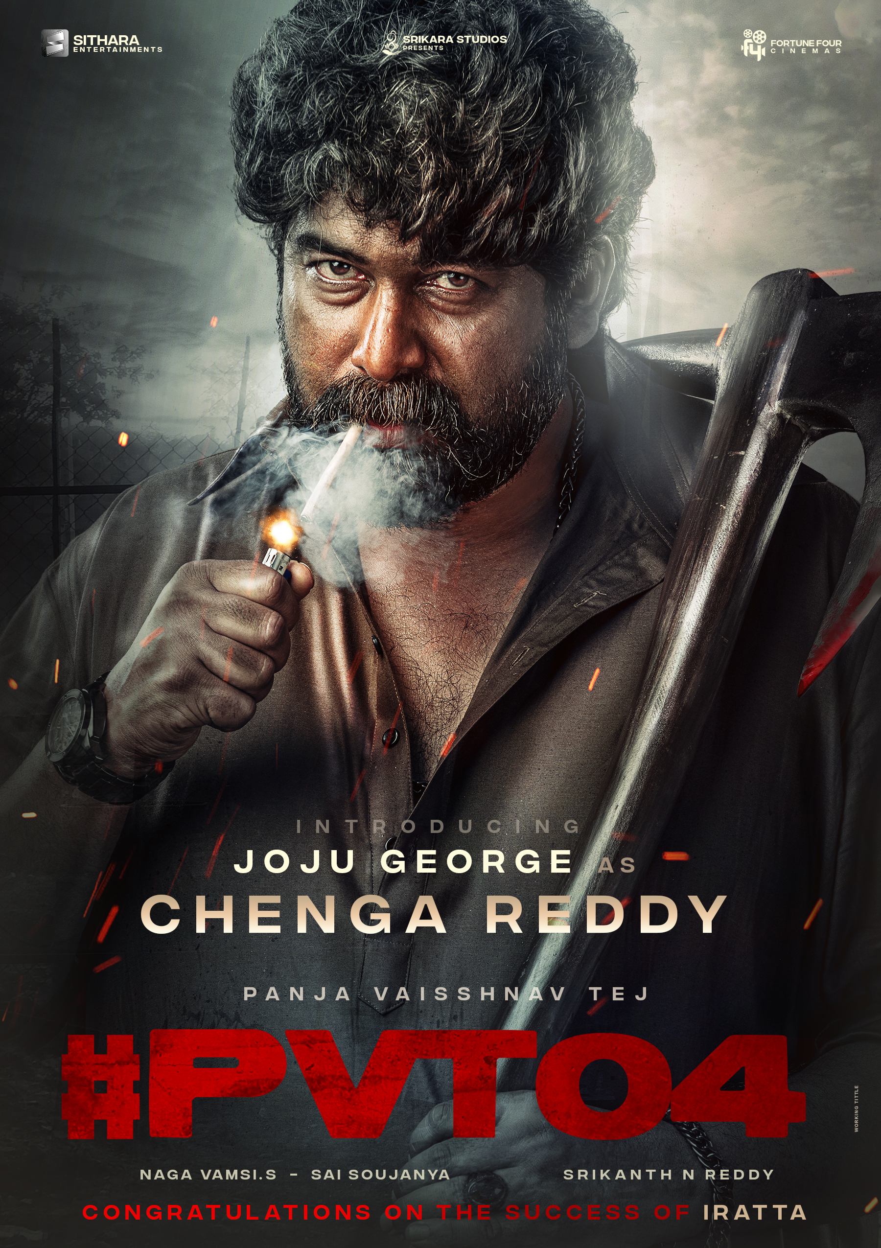 While sharing his look from the film, the makers, on their social media handles, wrote, “Introducing #JojuGeorge as ferocious, ruthless, troublesome "Chenga Reddy" in #PVT04.” In a rustic bearded avatar, while holding a weapon in his left hand, he is lighting a cigarette in the poster. The team also congratulated him on the success of Iratta in the poster.