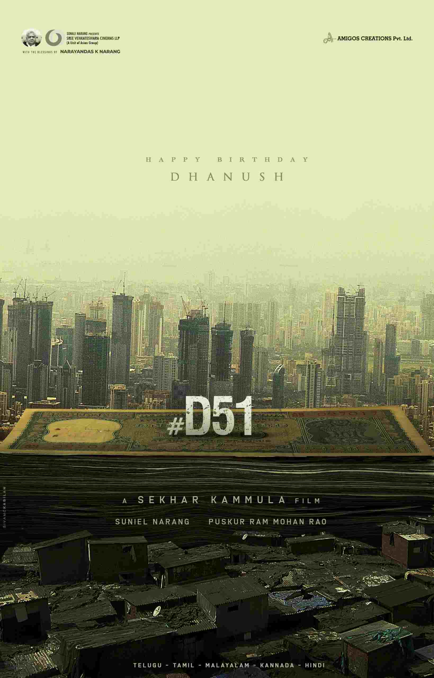 #D51, the craziest film in the combination of Dhanush and Sekhar Kammula, will be mounted on a grand scale in multiple languages with the blessings of Narayan Das K Narang, and will be produced by Suniel Narang and Puskur Ram Mohan Rao under their production house Sree Venkateswara Cinemas LLP (A Unit Of Asian Group), in association with Amigos Creations Pvt Ltd. Sonali Narang presents the movie.
