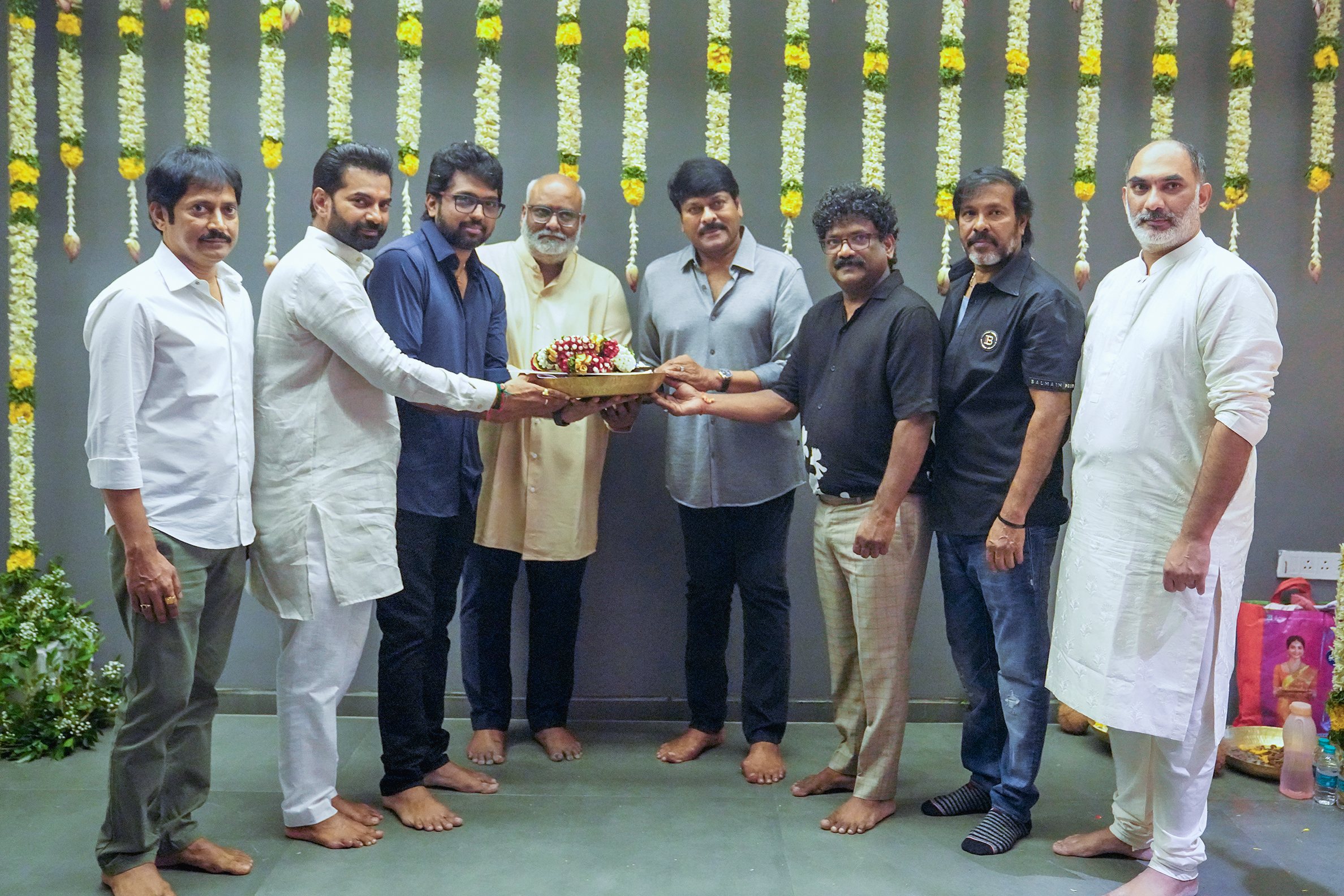 Bringing back the old tradition, before the launch, they started the film’s music recording. While speaking on the occasion, music director MM Keeravani said, “Good news for fans of megastar Chiranjeevi. The 14th production venture of UV Creations is the 156th movie of Chiranjeevi. The movie will have 6 songs. It's a tradition of starting the pooja formalities with music recording. Reviving that tradition, we wanted to start the proceedings with music recording. The works began with recording a celebration song. All the best Vassishta who is carrying the movie on his shoulders."