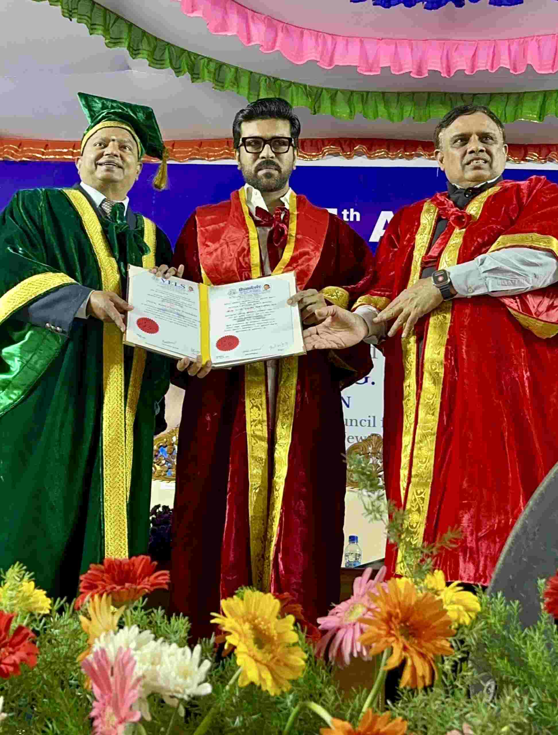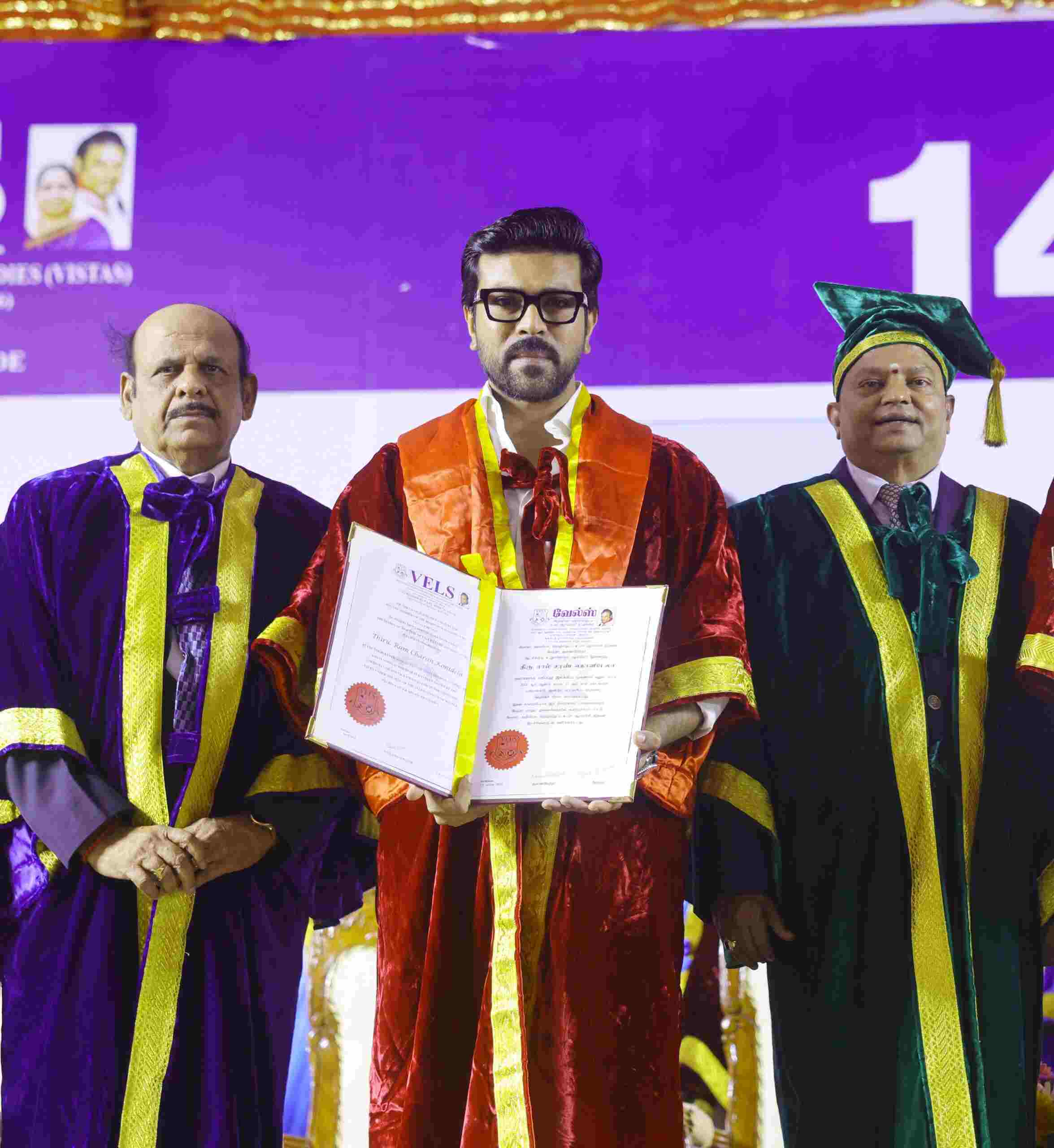 Vels University is known for recognizing distinguished personalities across various fields. This year the University decided to confer a doctorate to Ram Charan for his contribution to the entertainment industry and also as an entrepreneur. The event will be organized extravagantly on 13 April 2024. This year, along with Ram Charan, the university will be honoring personalities like: Dr.P. Veeramuthuvel, Project Coordinator, Chandrayaan, ISRO,Dr. GSK Velu, Founder & CMD, Trivitron Healthcare, Achanta Sharath Kamal, Renowned Table Tennis Player and Padma Shri recipient.
