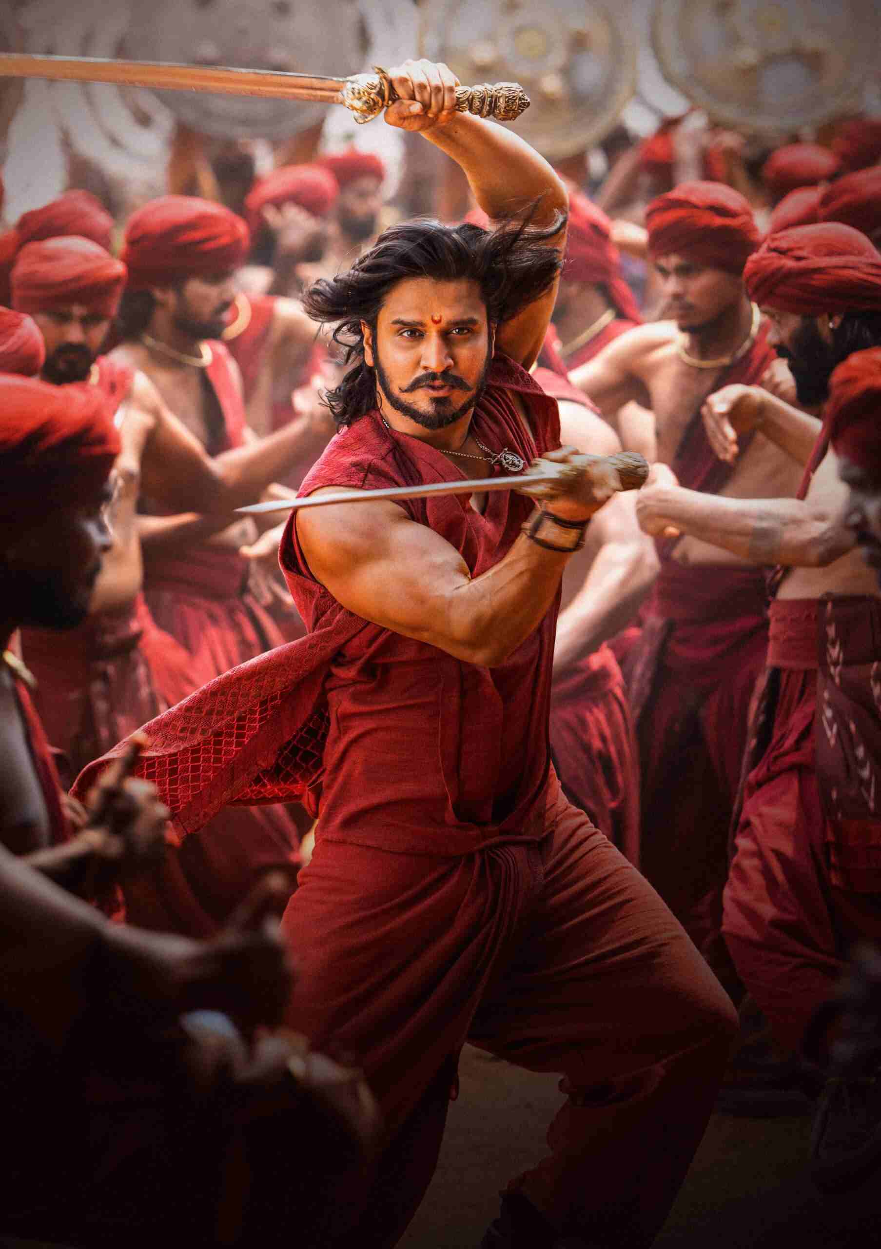 The makers released a special poster featuring Nikhil, on the occasion of the actor’s birthday. It presents Nikhil as an ambidextrous legendary warrior with two swords in two hands, taking on numerous opposite soldiers in the war. Wore a maroon color costume and sported long hair, a twirled mustache, and a beard, Nikhil looked like a beast, flaunting his biceps.