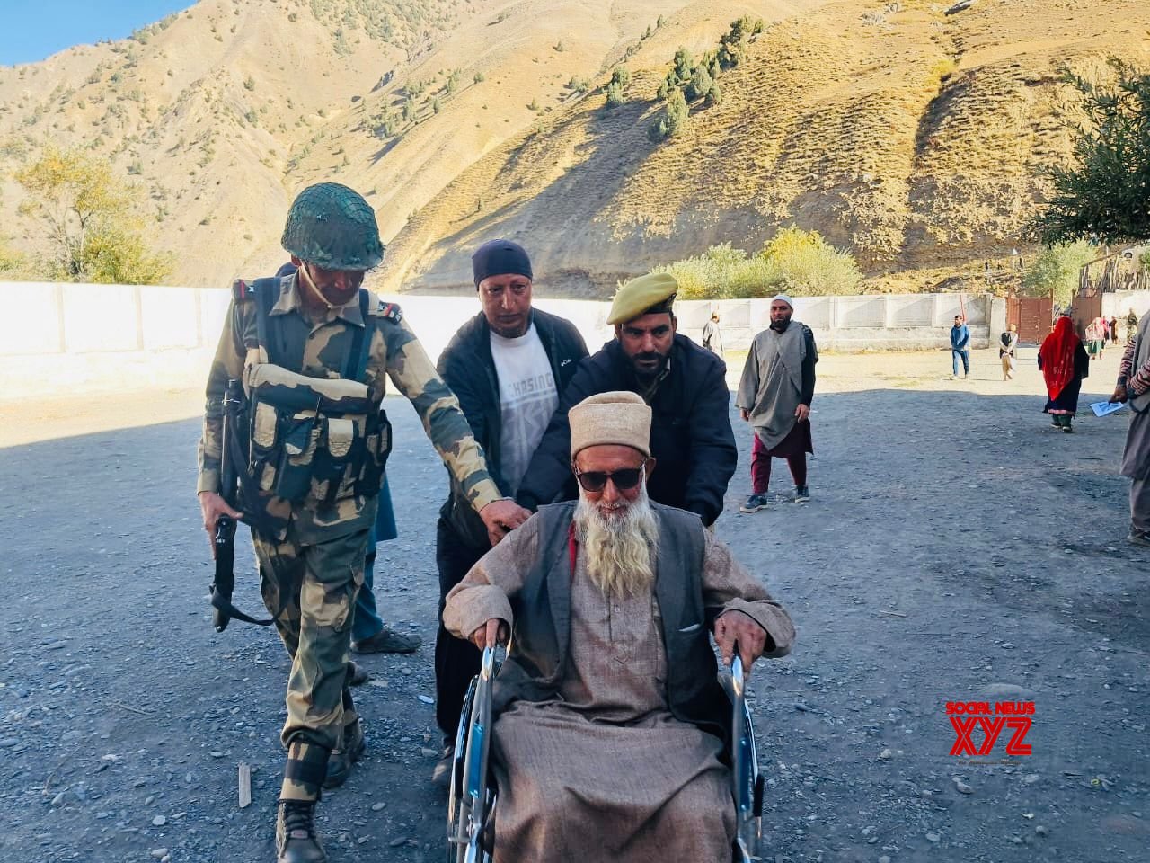 - Jammu: An elderly voter is assisted by volunteers and security personnel at a polling station during the third phase of the Jammu & Kashmir Assembly elections on Tuesday, October 01, 2024. (Photo: IANS)