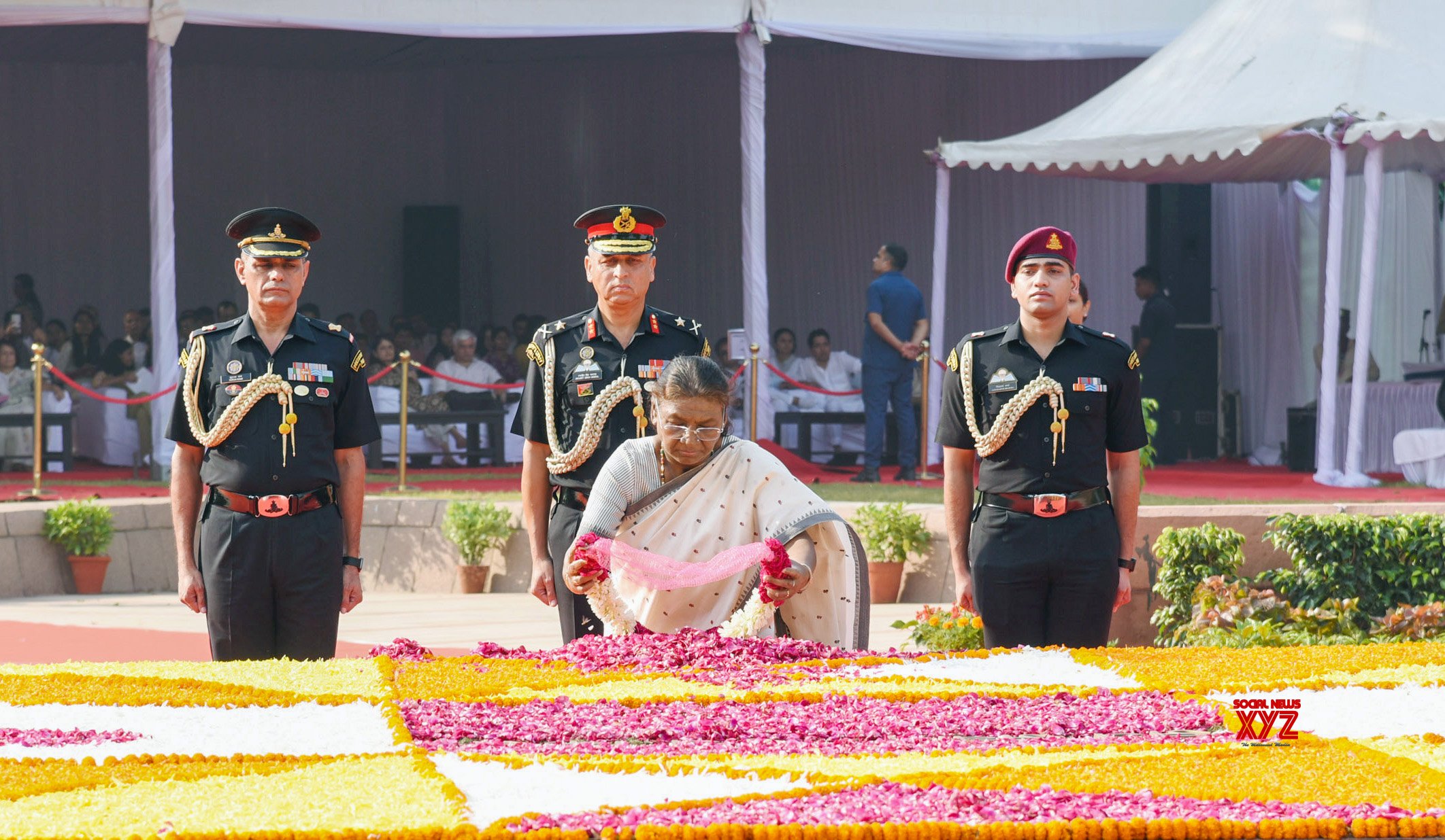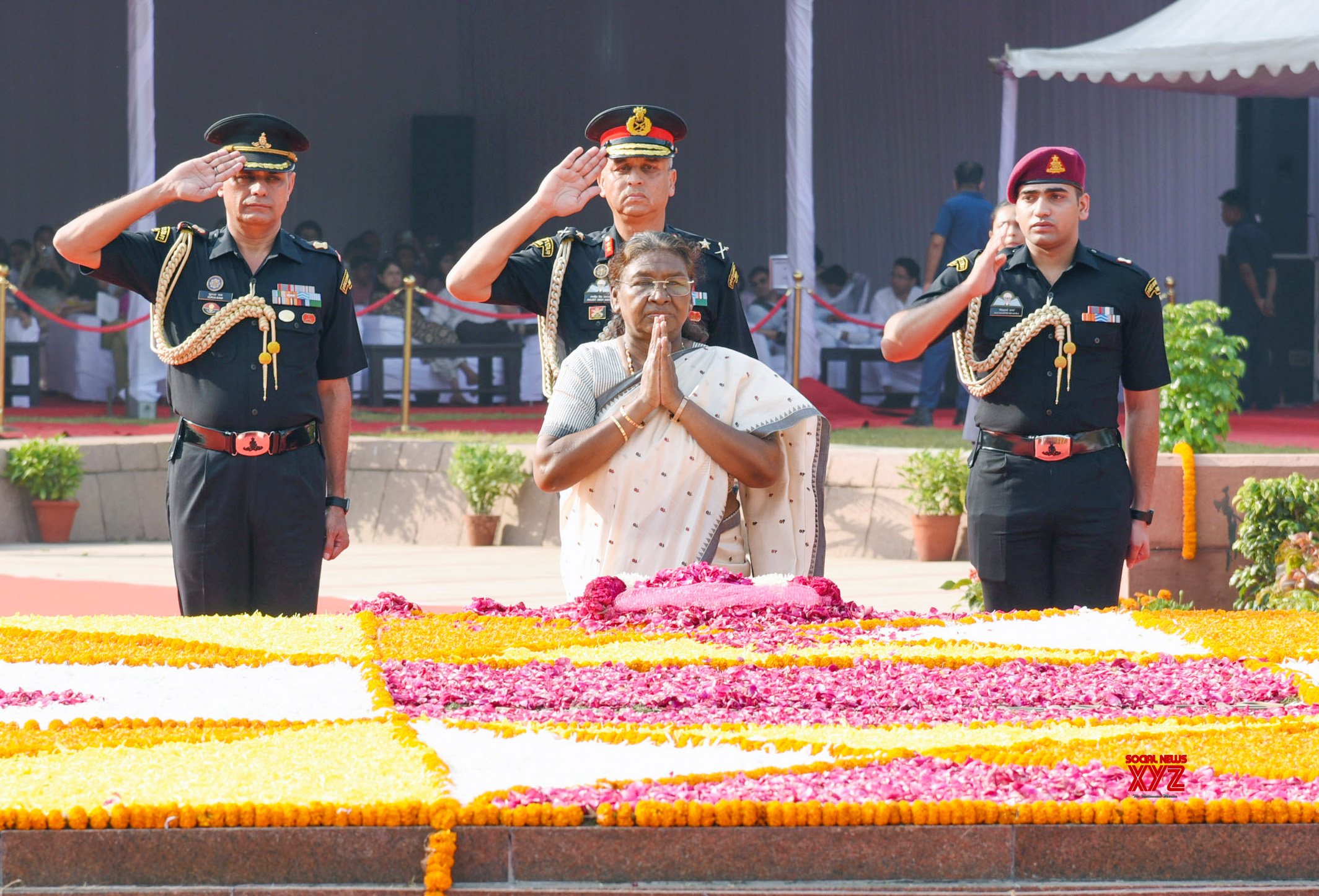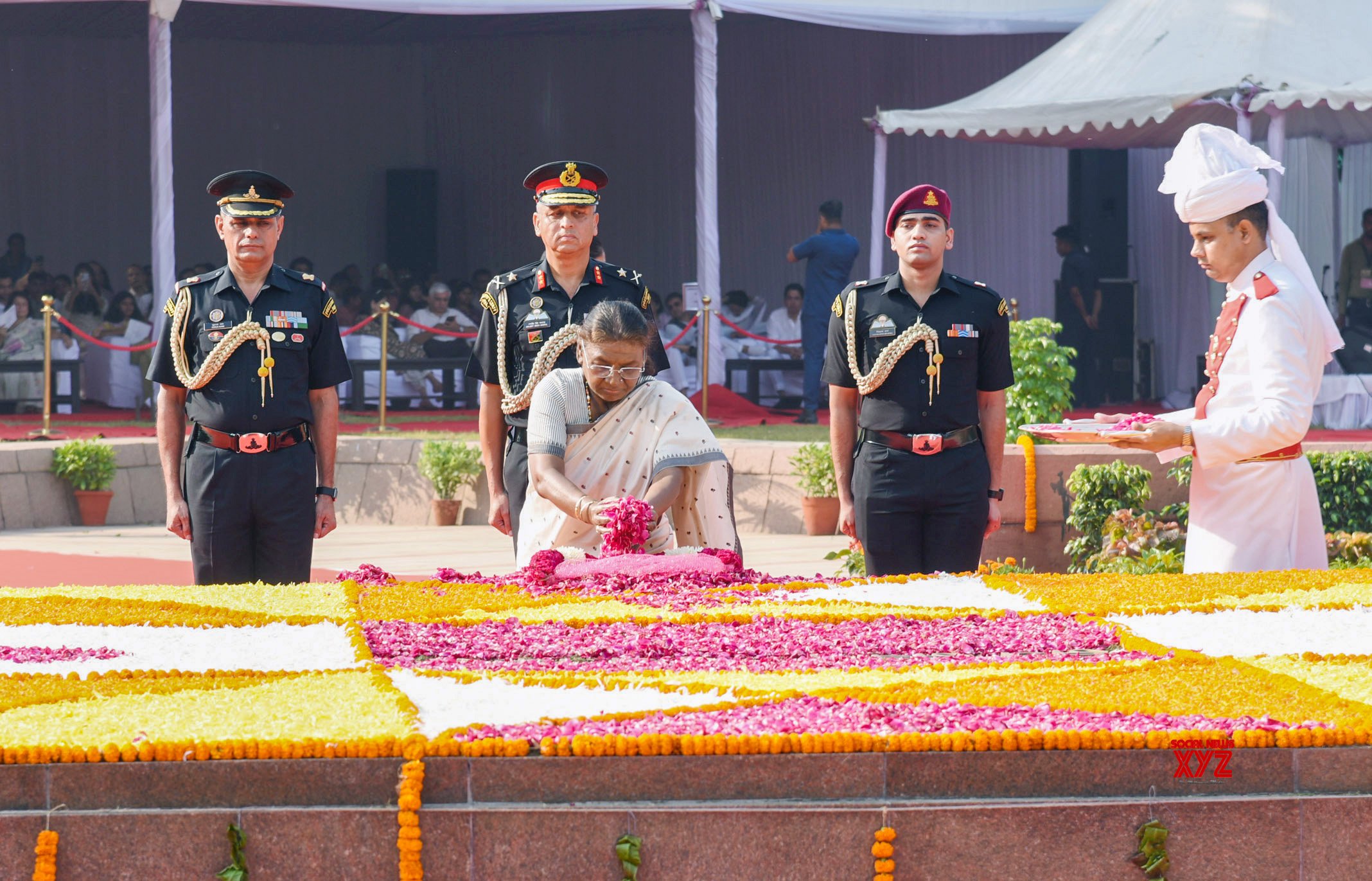 - New Delhi: President Droupadi Murmu pays floral tributes at the Samadhi of former Prime Minister Lal Bahadur Shastri at Vijay Ghat on Wednesday, October 02 2024. (Photo: IANS)