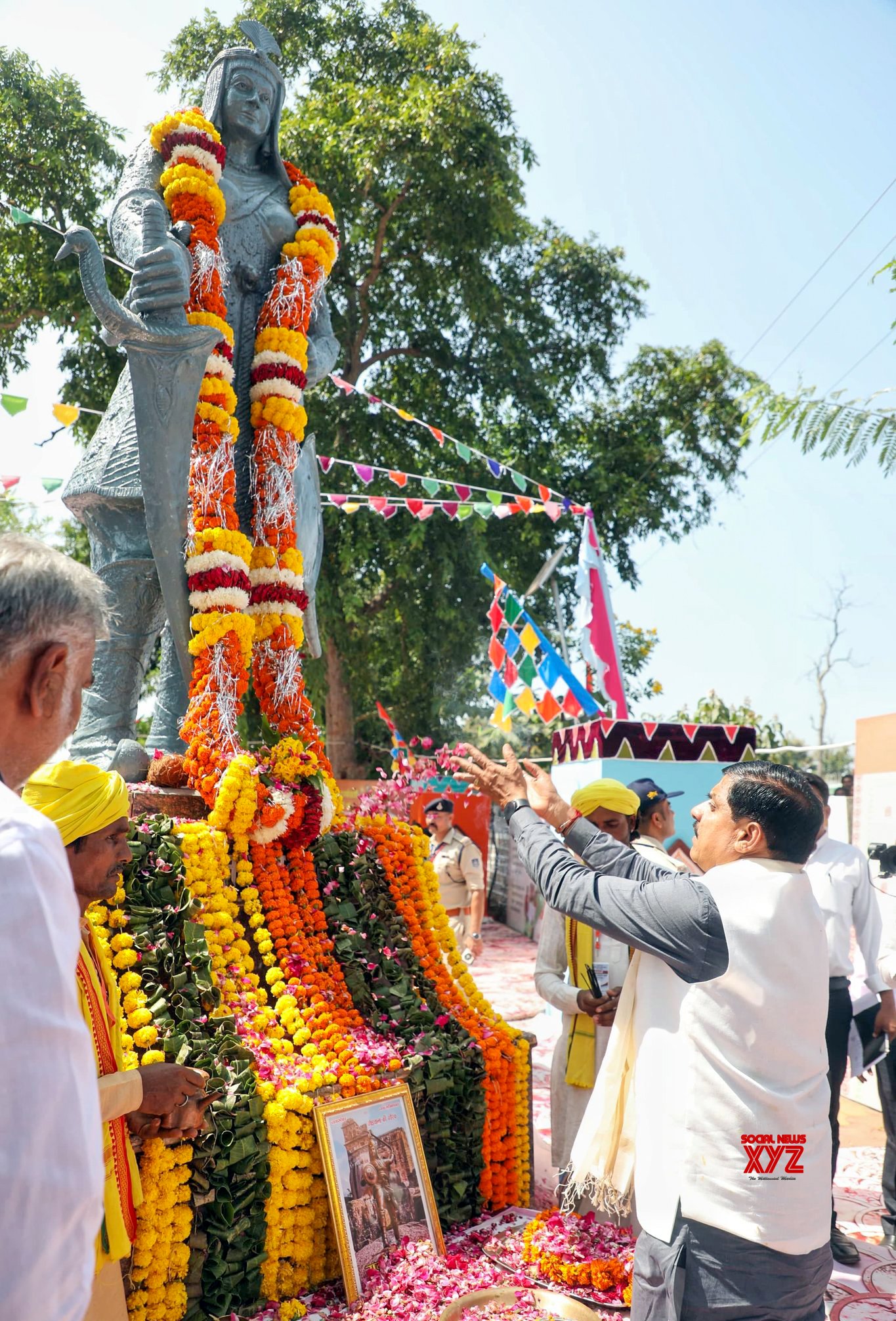 - Damoh: Madhya Pradesh Chief Minister Mohan Yadav pays homage to the bust of Rani Durgavati at Singharpur in Damoh district on Saturday, October 05, 2024. (Photo: IANS)