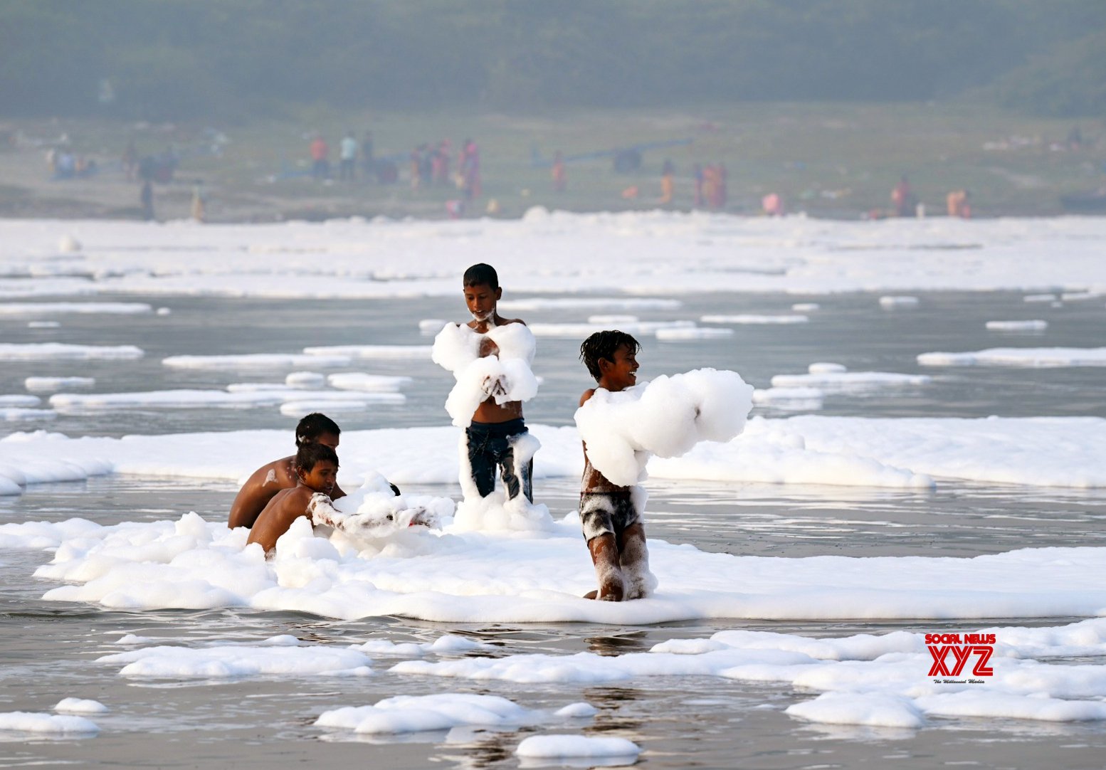 - Noida: Children take a holy bath as toxic foam seen floating during ‘Nahaye Khaye puja’ on the occasion of the Chhath Puja festival in Noida on Tuesday, November 05, 2024. (Photo: IANS)