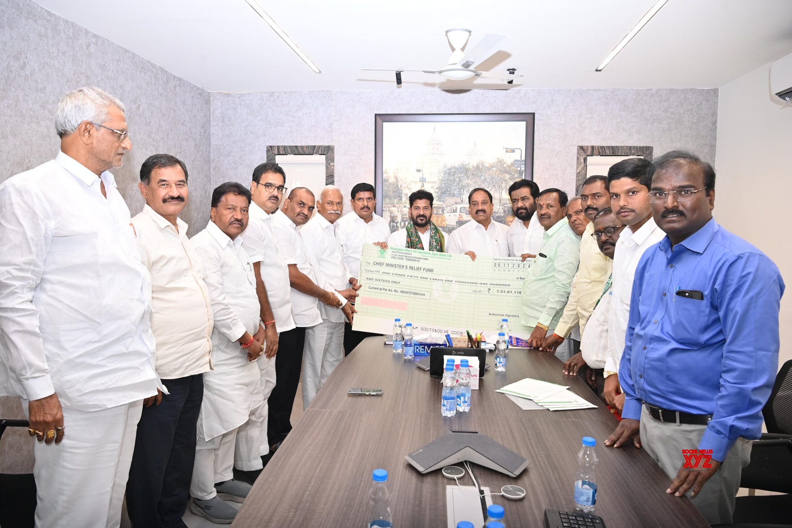 - Hyderabad: Telangana Chief Minister Revanth Reddy receives a cheque of rupees 1.51 crore from Telangana State Co-operative Apex Bank Limited (TGCAB) for the Chief Minister’s Relief Fund. TGCAB officials hand over the donation at his residence in Hyderabad on Wednesday, November 6, 2024. (Photo: IANS)